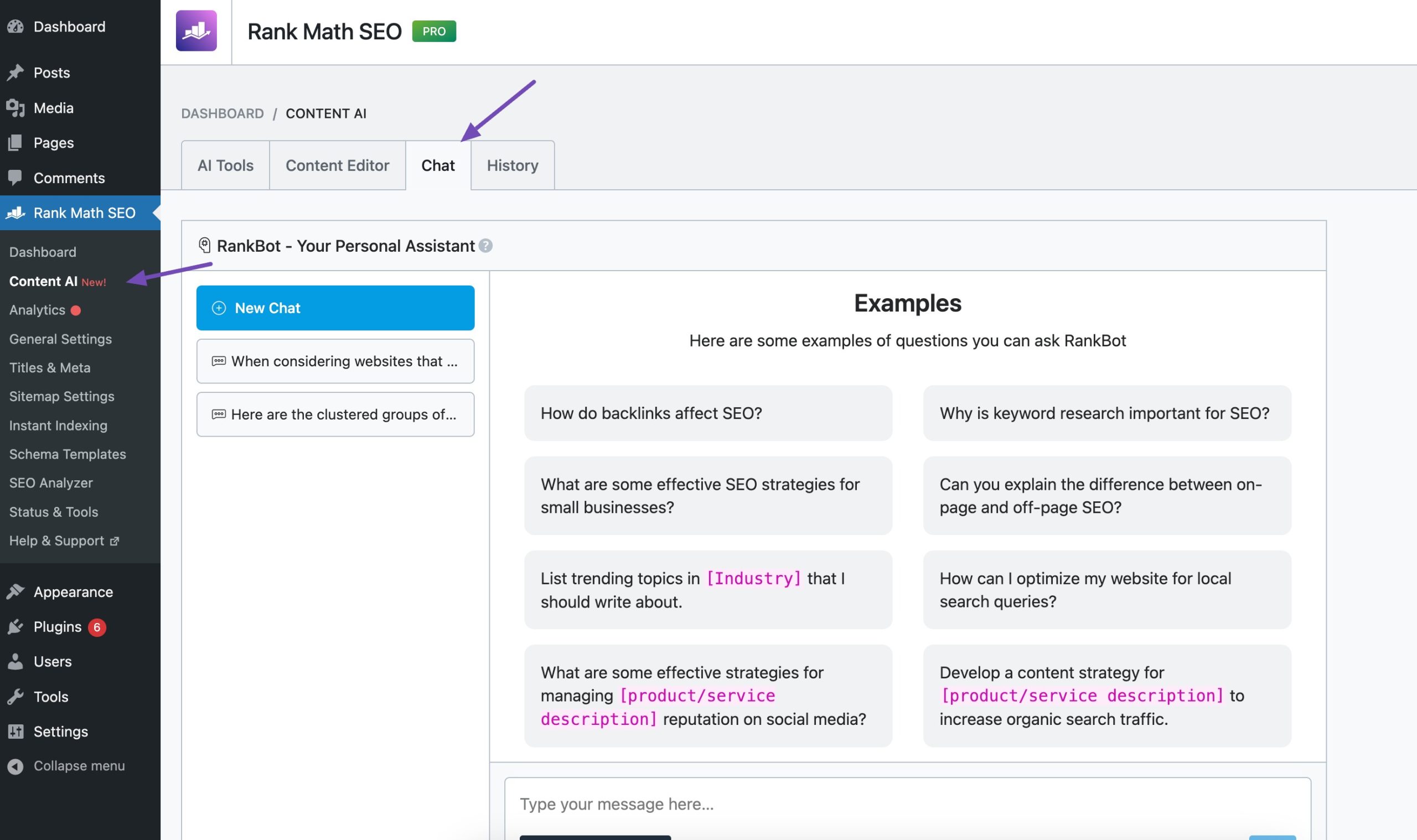 Navigate to Rank Math SEO → Content AI → Chat from your WordPress dashboard. Ensure you’ve enabled the Content AI module.