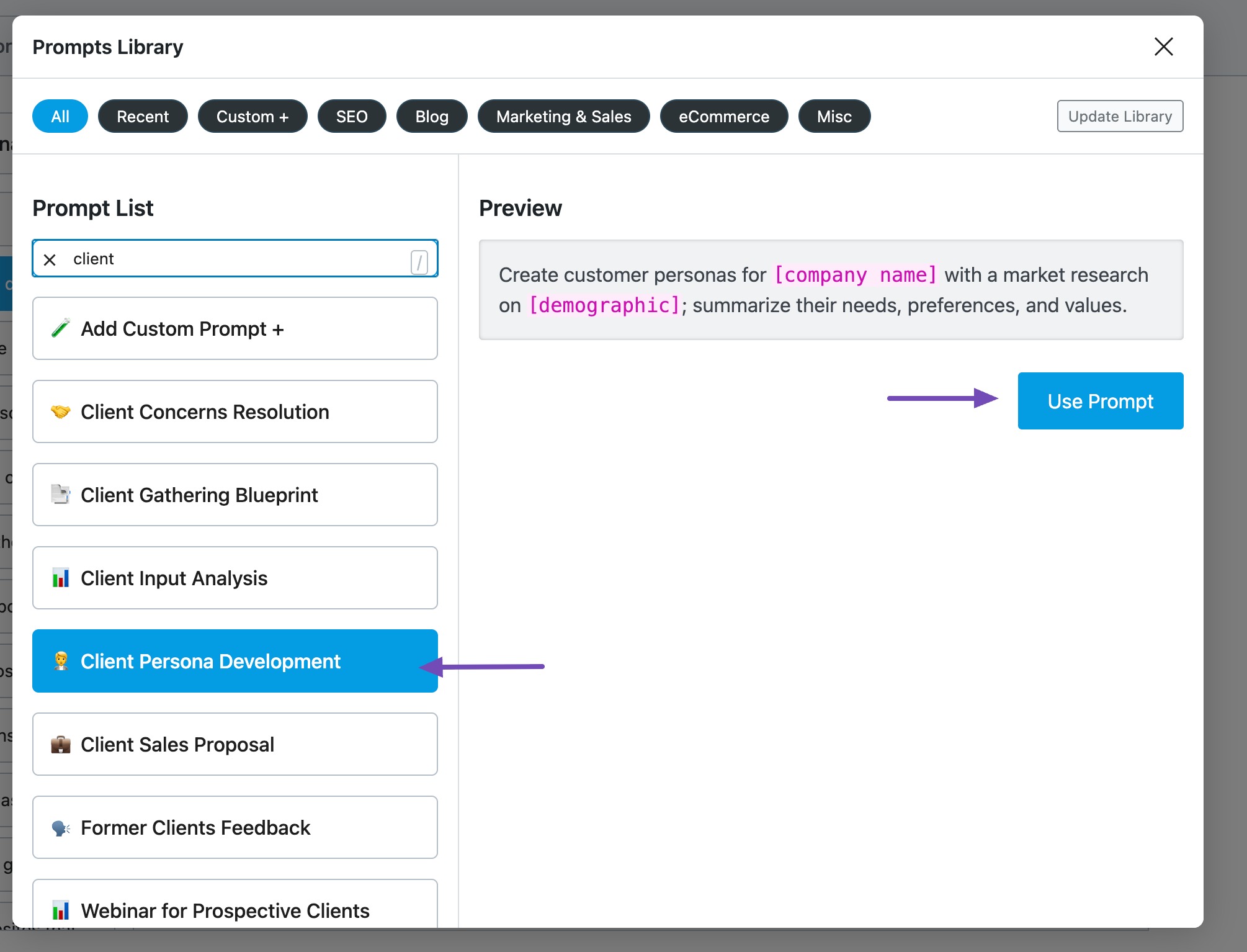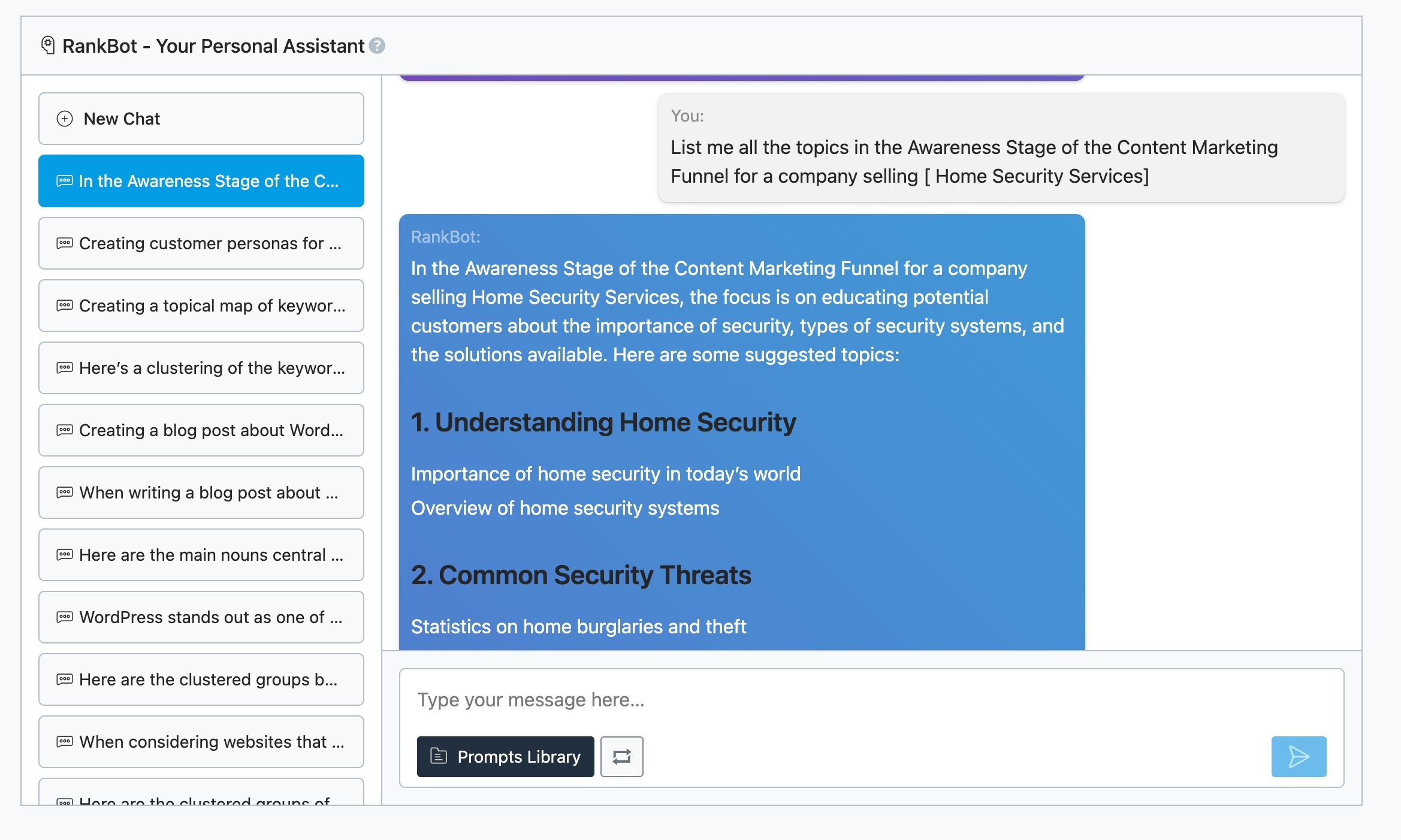 RankBot will further help you create the client profiles for each specific audience segment. You can either enter a prompt or choose a prompt from the Prompts Library.