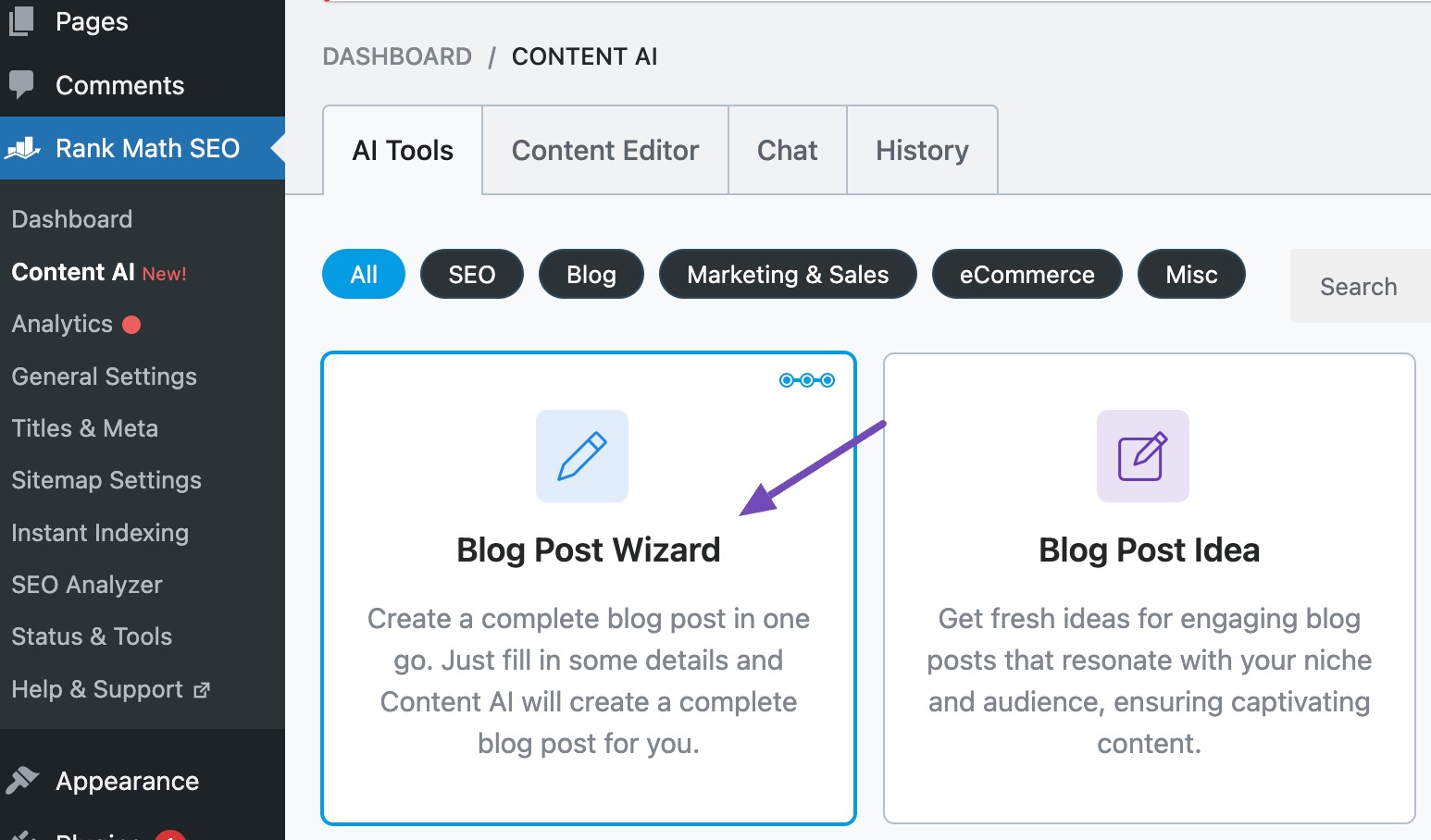 You can use Rank Math’s Blog Post Wizard AI tool to create a post entirely from scratch. To use our Blog Post Wizard tool, enable the Content AI module from your WordPress dashboard.