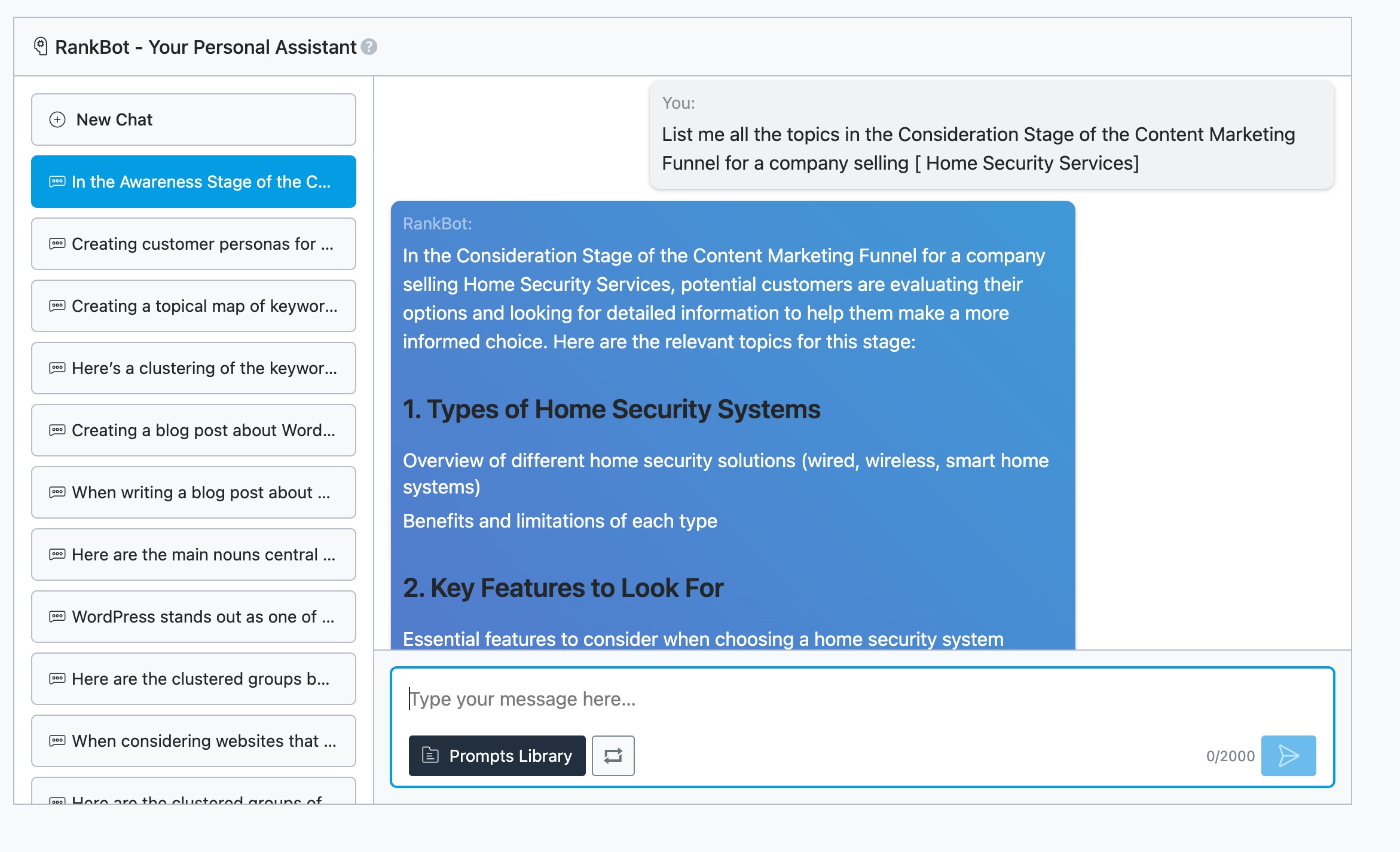 Continuing with the home security example, you can find relevant topics with RankBot, such as Comparing DIY vs. Professional Home Security Systems or The Benefits of Smart Home Security Technology.