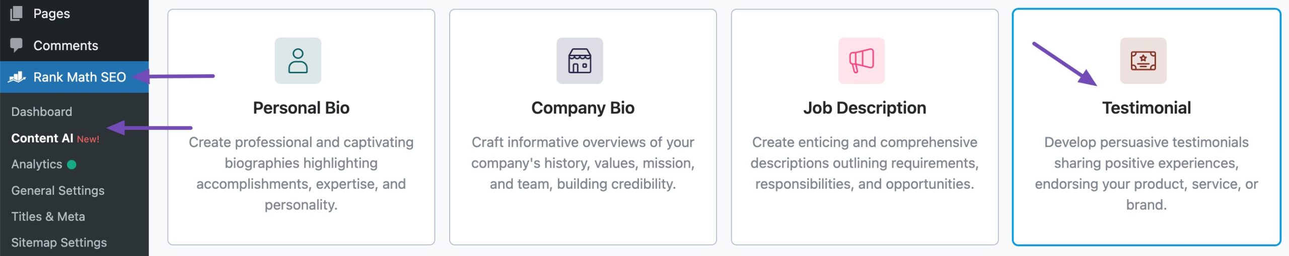 You can use our Testimonial AI tool to create testimonials. Select the Testimonial tool by navigating to Rank Math SEO → Content AI → AI Tools from your WordPress dashboard.