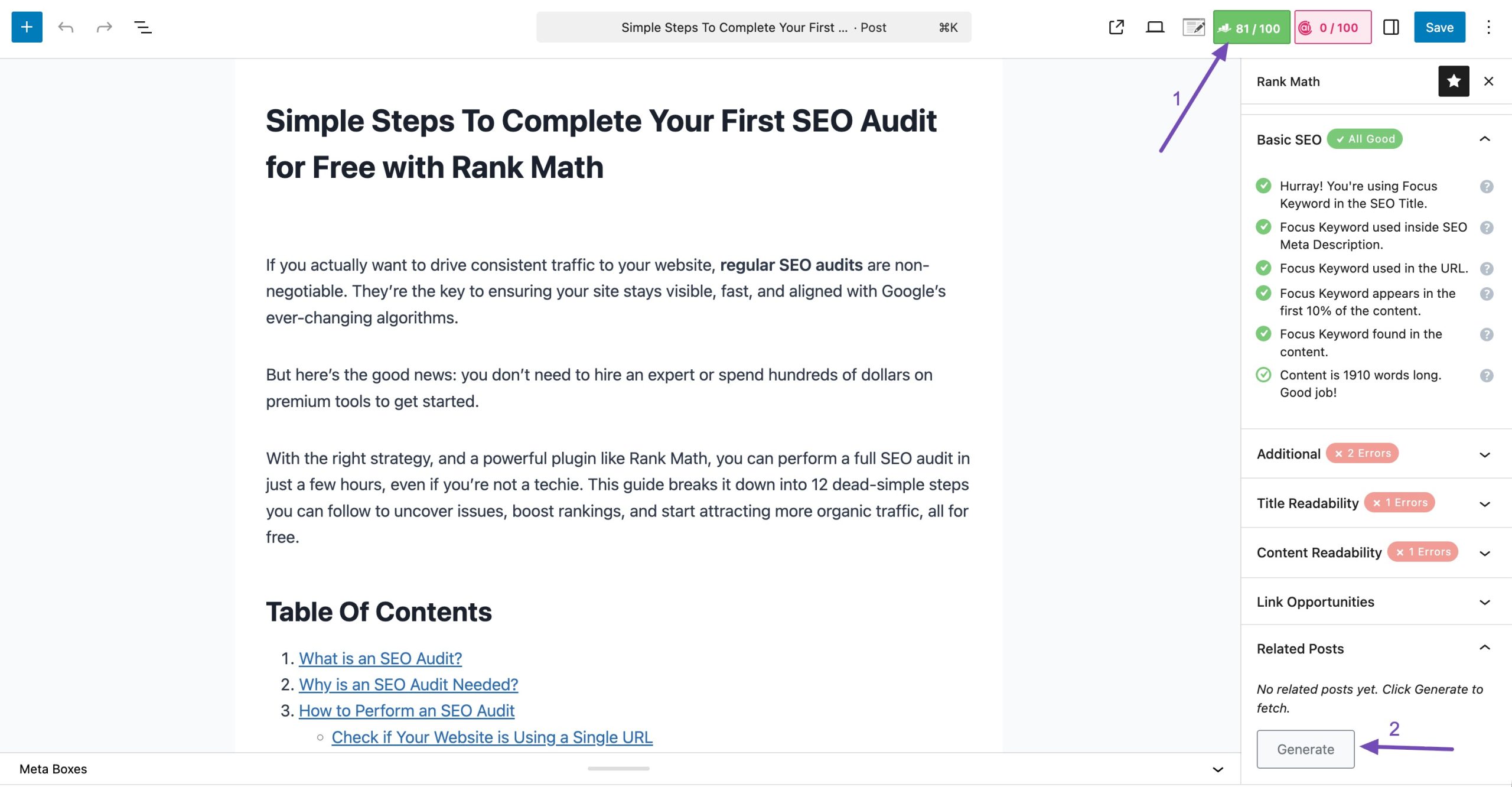 To add related posts, open your article in the WordPress post editor. Click the Rank Math SEO icon and scroll down until you see the Related Posts section. Then click Generate.