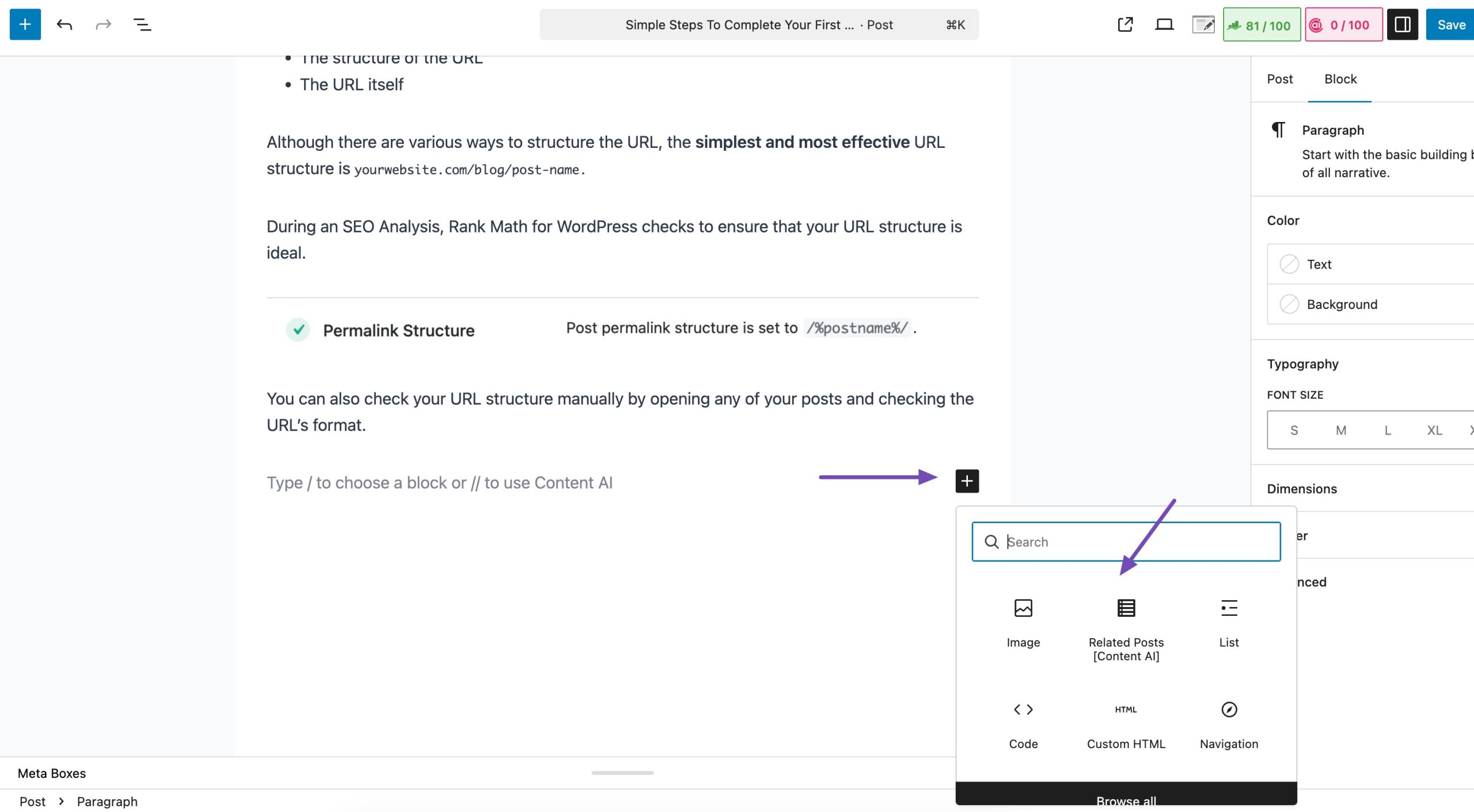 If you are using a Block Editor, click the + icon and locate the Related Posts [Content AI] block, as shown below.