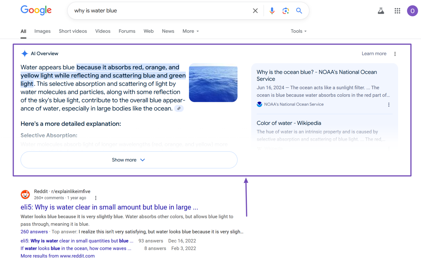 AI Overviews can also appear at other locations on the search results page. For instance, this one appears below the topmost-ranking organic result.