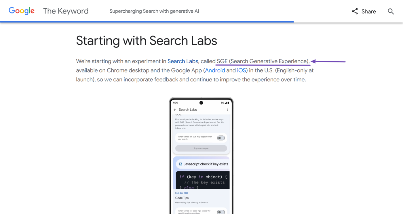 In the blog post, Google did not refer to its generative AI search as AI Overviews as we know it today. Instead, it called it the Search Generative Experience (SGE).