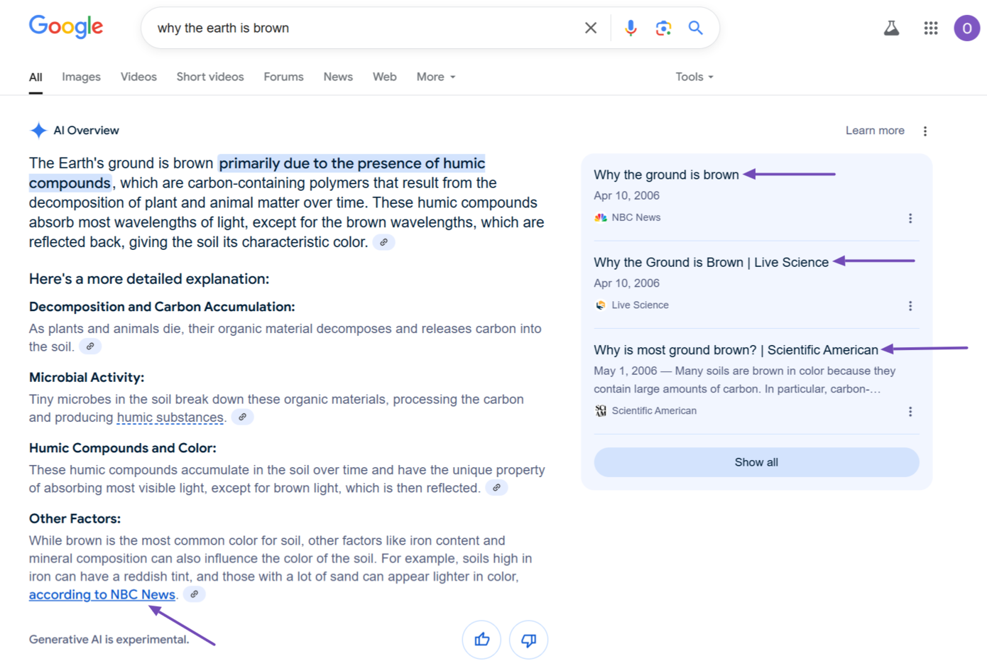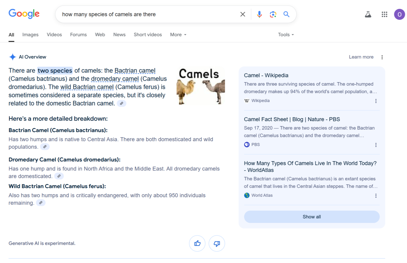While such errors are common with generative AI, they can cause confusion and misdirect AI Overview users. This is also concerning, considering many visitors consider Google a trustworthy source of information and may only check the AI Overviews without reviewing the rest of the results.