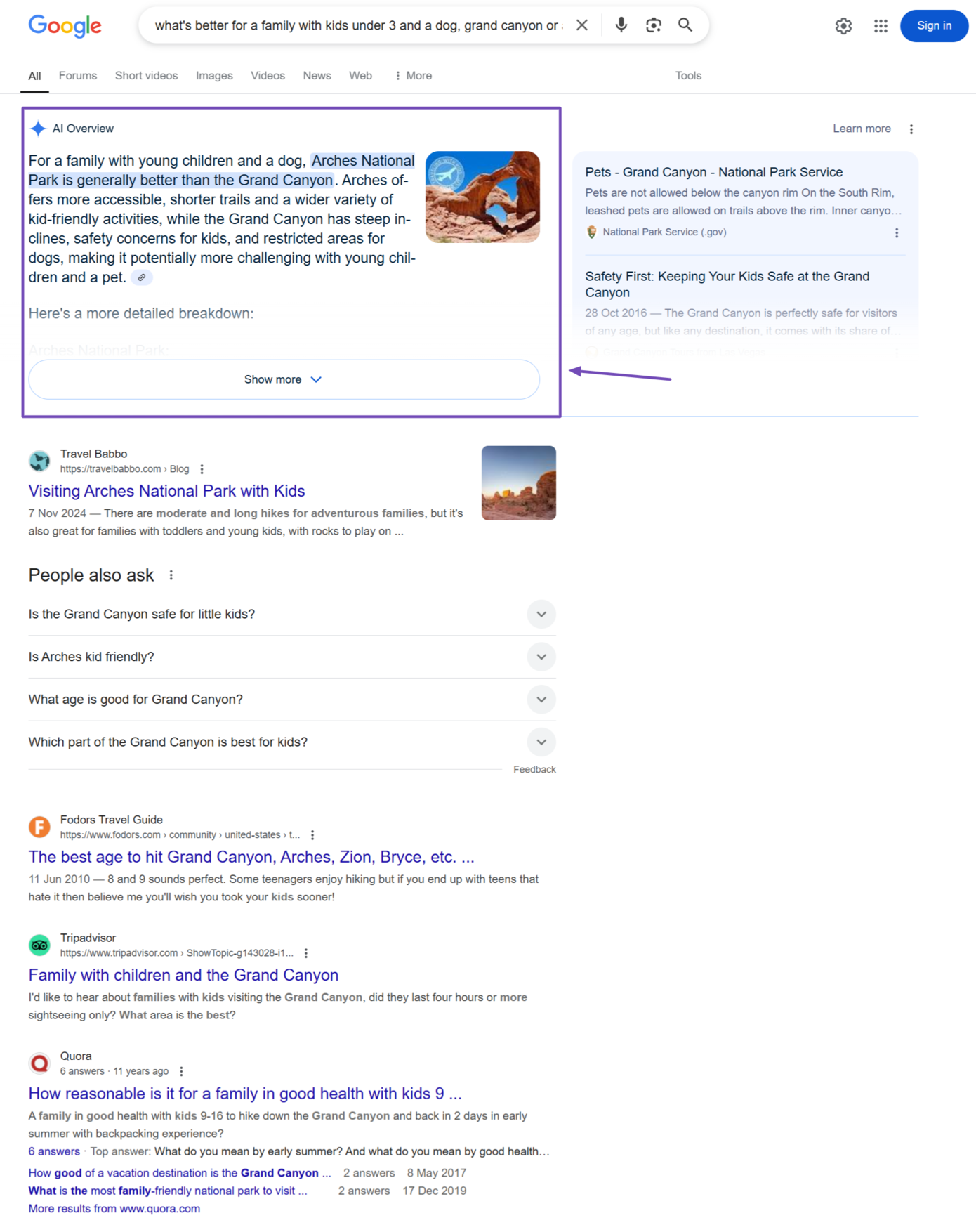For instance, only AI Overviews returns a relevant answer when we search for "what’s better for a family with kids under 3 and a dog, grand canyon or arches”.