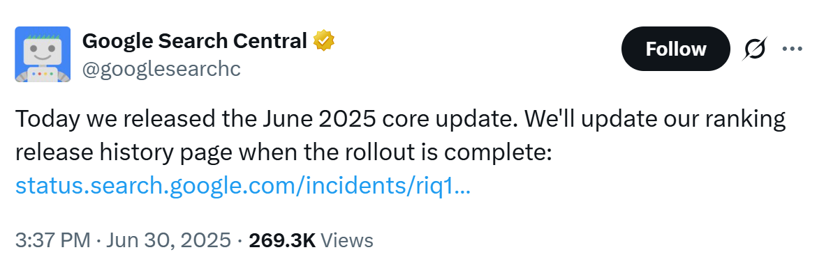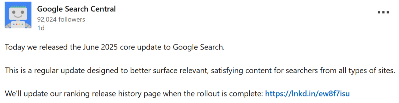 Google announced the release of the June 2025 Core Update on X (formerly Twitter) and their LinkedIn page.