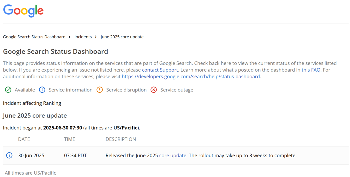 Google released the June 2025 Core Update on June 30, 2025, and completed it on July 17, 2025. The update rolled out for two and a half weeks, a few days short of the three weeks originally slated for its completion.