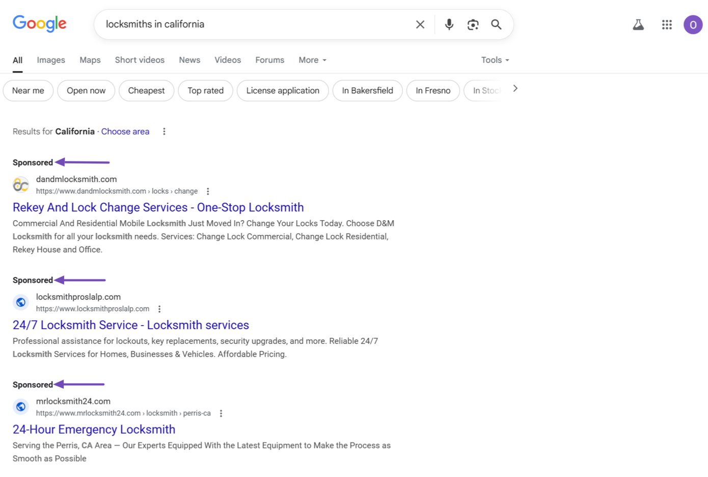 For example, a visitor who enters a query like “locksmiths in California“ will be shown relevant ads for locksmiths in California. This is because the ads were set up to appear for keywords related to locksmiths in California
