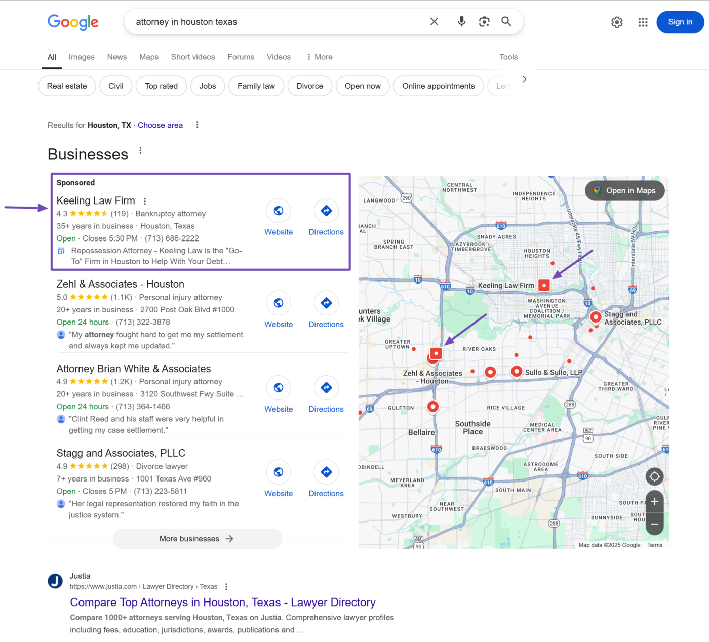 Talking of the search results page, Google can also display ads at various locations other than the top of the search results page. For example, the image below shows ads in the Google local pack listing and in the map itself. (The ads in the map are represented by square icons.)
