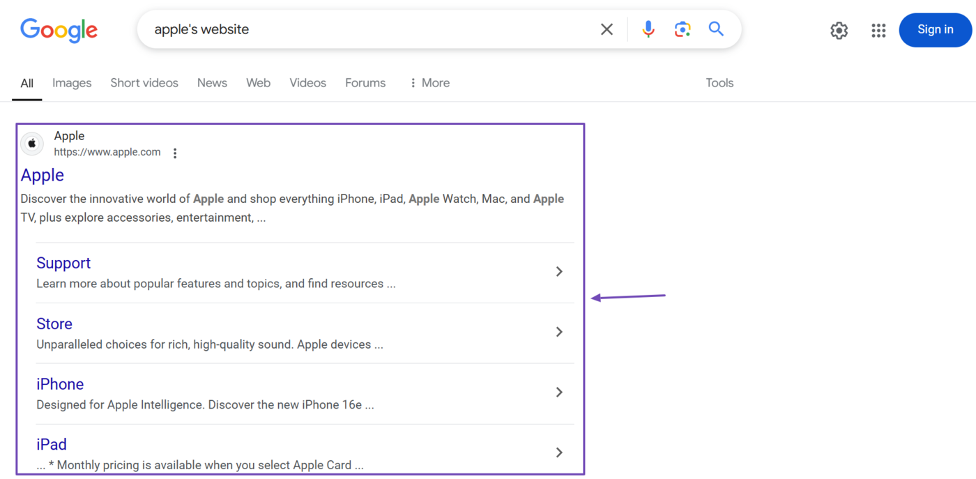 For example, when a visitor living in an English-speaking country like the United States searches for “Apple’s website,” Google returns a results page of Apple’s website in the English language.