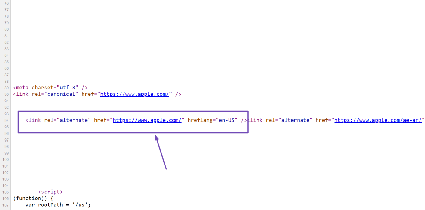 Apple can do this because they included relevant hreflang attributes to their site. Specifically, their site contains the HTML code indicating the webpage version intended for English-speaking visitors residing in the United States.