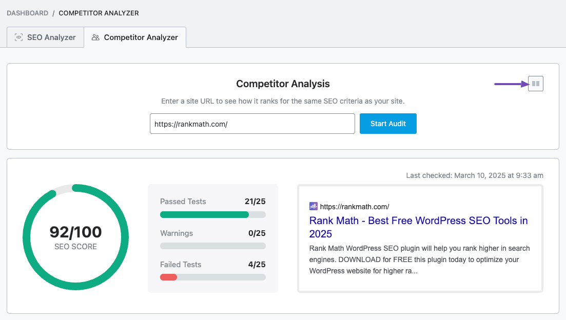 Rank Math PRO users can access the SEO Analyzer from their WordPress dashboard. If you don’t have PRO, you can use our free SEO Analyzer tool. Enter your competitor’s URL into the available field and click ANALYZE.