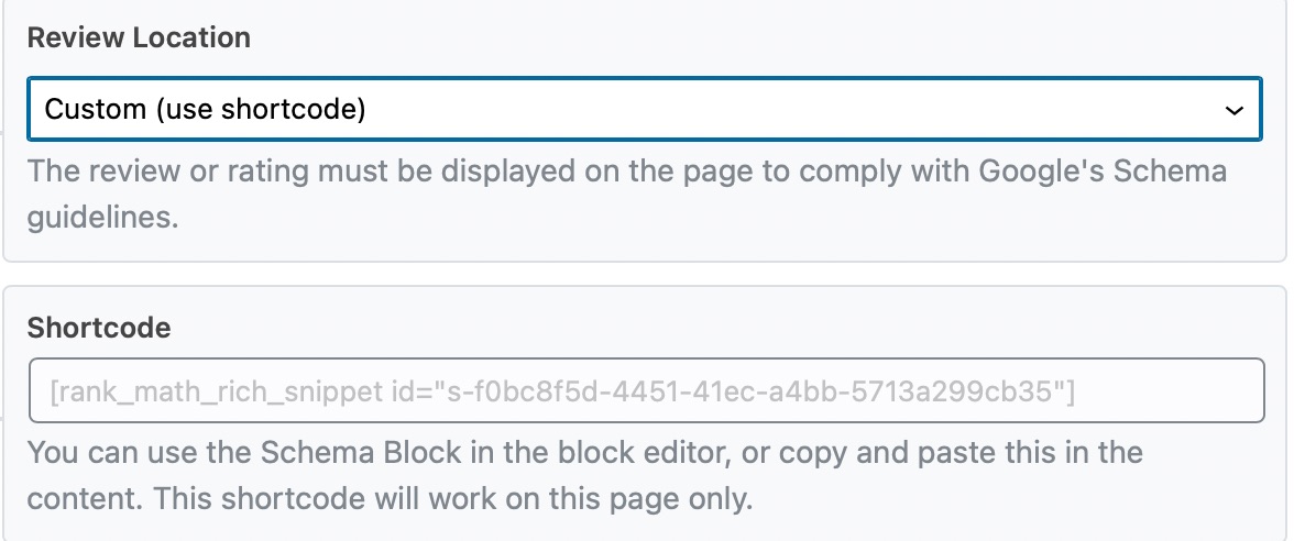 If you use the first 3 options, then the Schema will be added to the page automatically. But if you choose to use the Custom option, you need to copy and paste this shortcode inside your post.