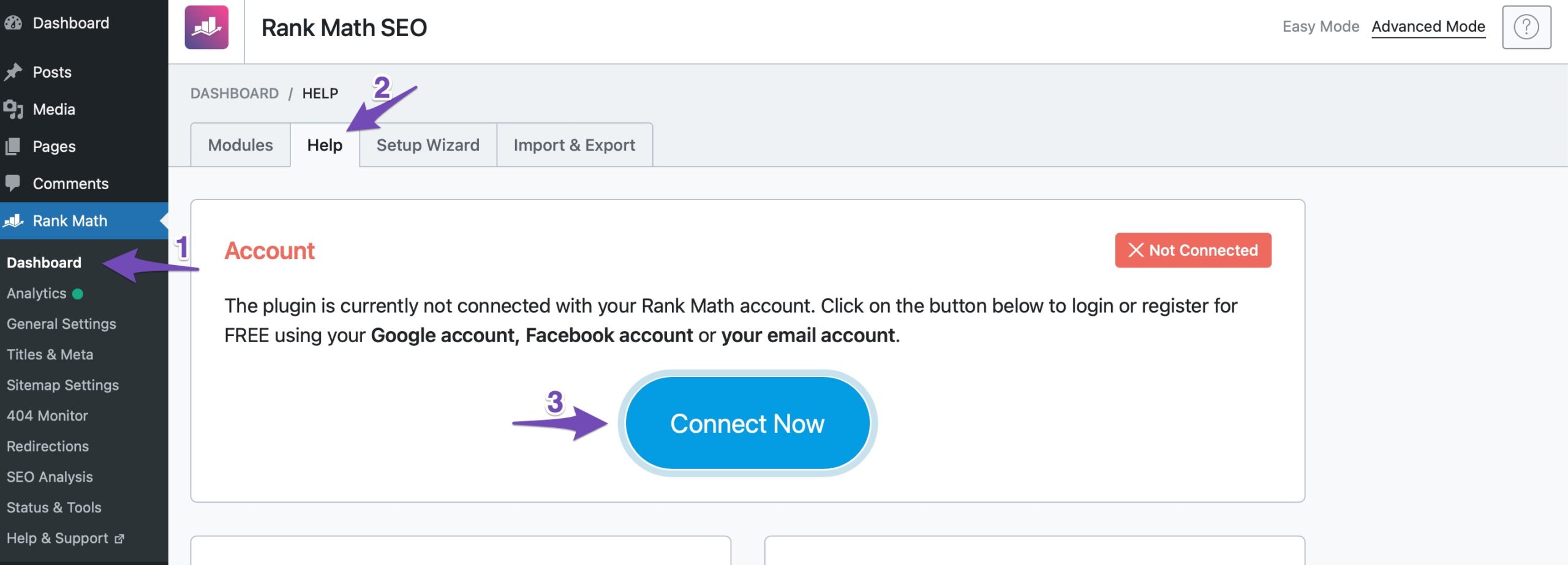 So, you’ll need to create a free rankmath.com account and connect it to your website by navigating to WordPress Dashboard → Rank Math SEO → Dashboard → Help and clicking the Connect Now button.