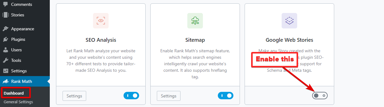 Rank Math has a module for optimizing Google Web Stories already, but you will need to activate it to use it. Head over to Rank Math SEO → Dashboard and look for the Google Web Stories module. Make sure the toggle is turned on.