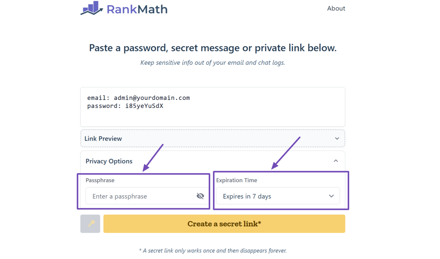 When you use Rank Math SEO Care, you will need to share your credentials with us so we can access your site. For confidentiality purposes, you will do so using the Rank Math vault and then send the secret link to us. Once done, our team will access your credentials, after which the vault automatically deletes itself.