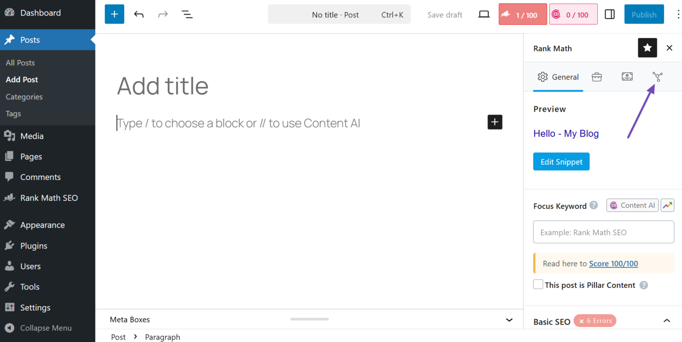 Once Rank Math is installed and activated, open the post or page editor. Then, click the Rank Math SEO icon, as shown below.