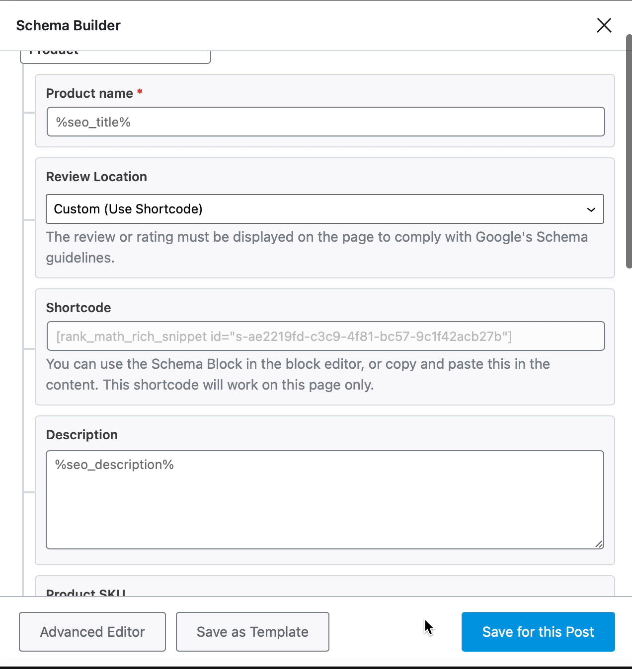 The default variable %url% includes the URL of the current post/page, where you’re adding this Product Schema. If the product is available on an external website like Amazon, then enter the URL of the product here.