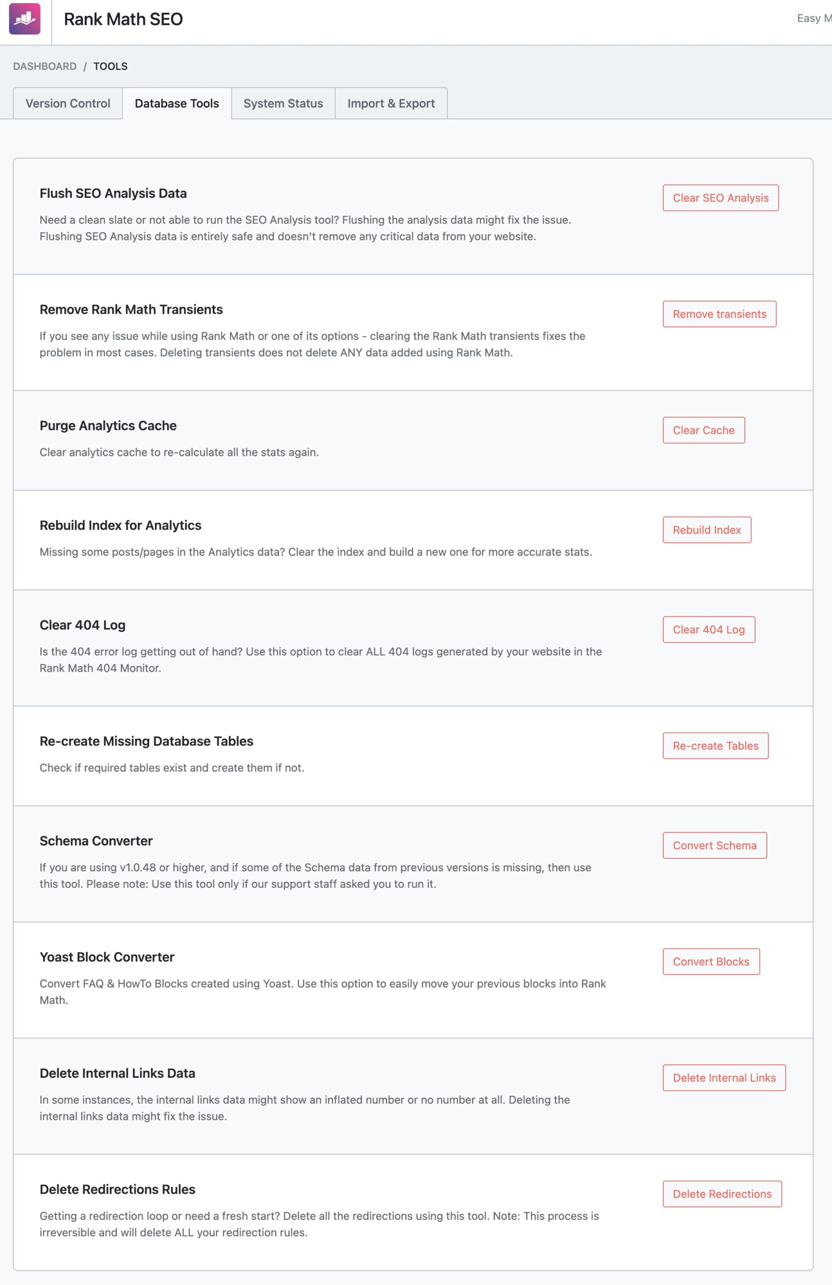 Before we explain each of the options, let us explain the need for Database Tools. There are many scenarios where you want to reset one or more of Rank Math’s settings. Major website changes, architecture changes, or content re-organization are just some of the scenarios where you’d want to erase or reset one or more settings.