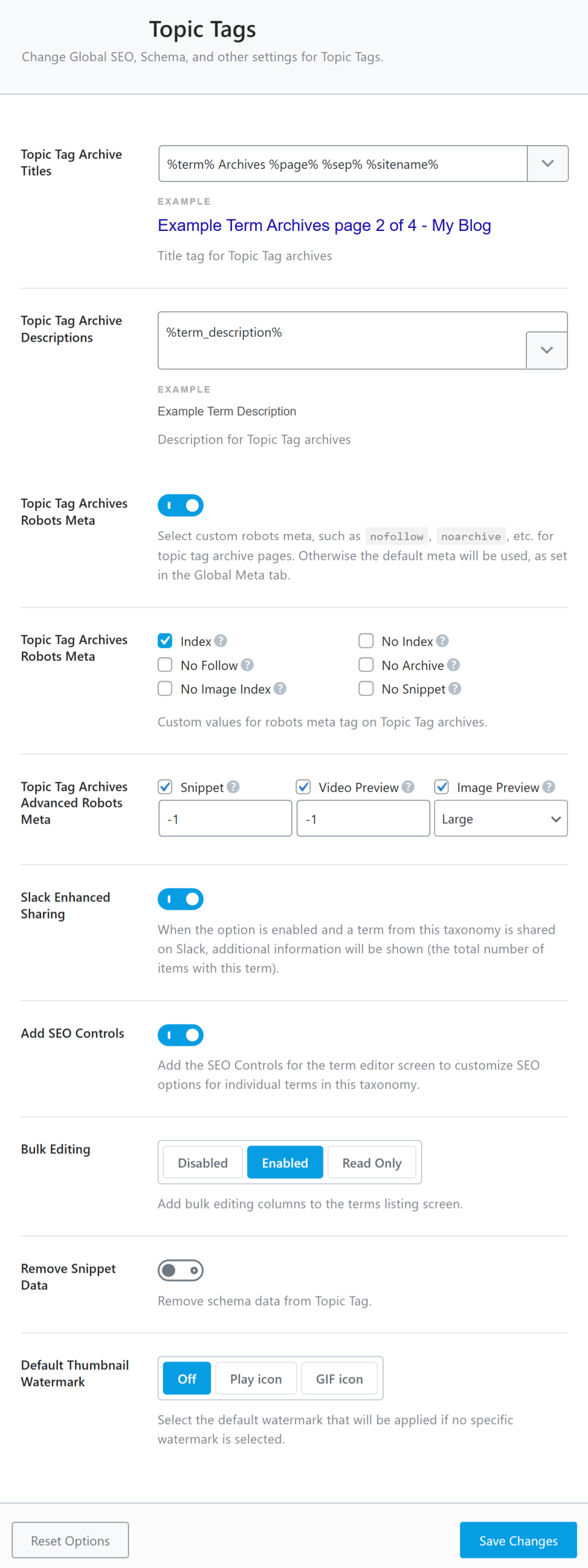 The Bulk Settings option allows you to edit your download tag’s SEO titles and descriptions in bulk. It contains three options and is only available when you enable Add SEO Controls.