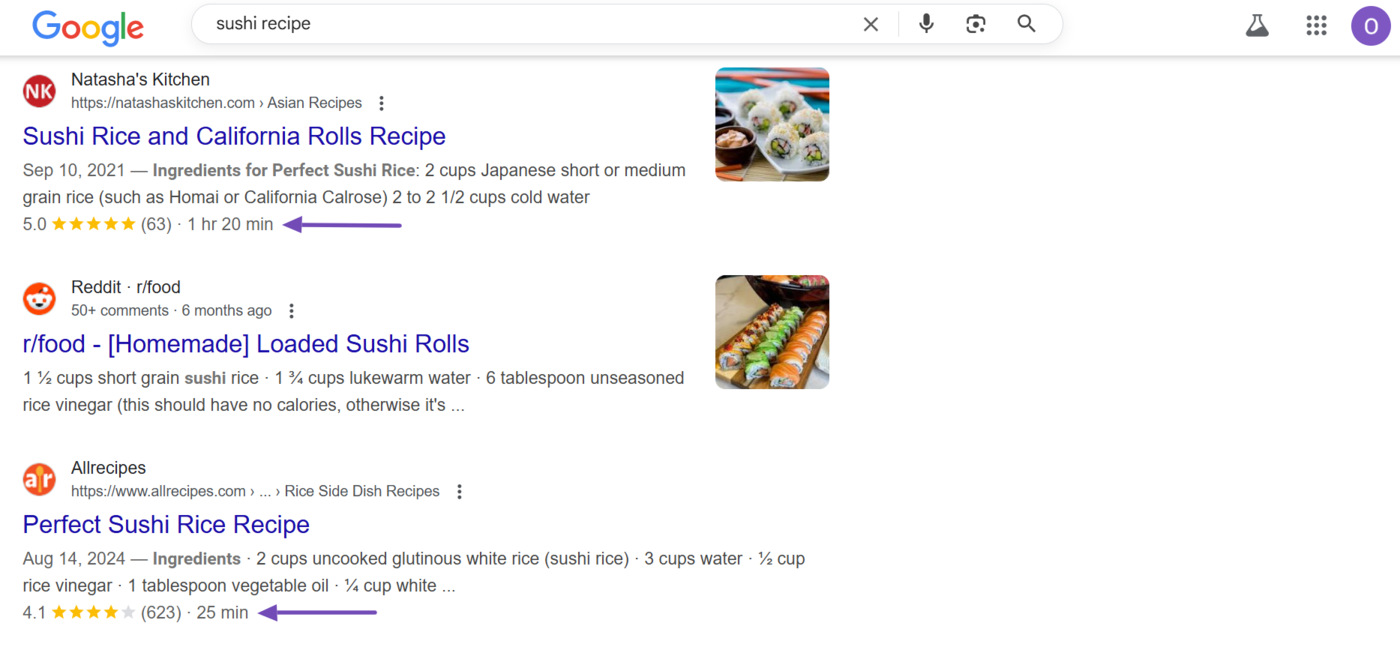 Structured data also improves the chances of your content appearing as rich results, which makes your listings more informative and visually appealing on the search results page. For example, the star ratings and cook time on the search results page in the image below are rich results.