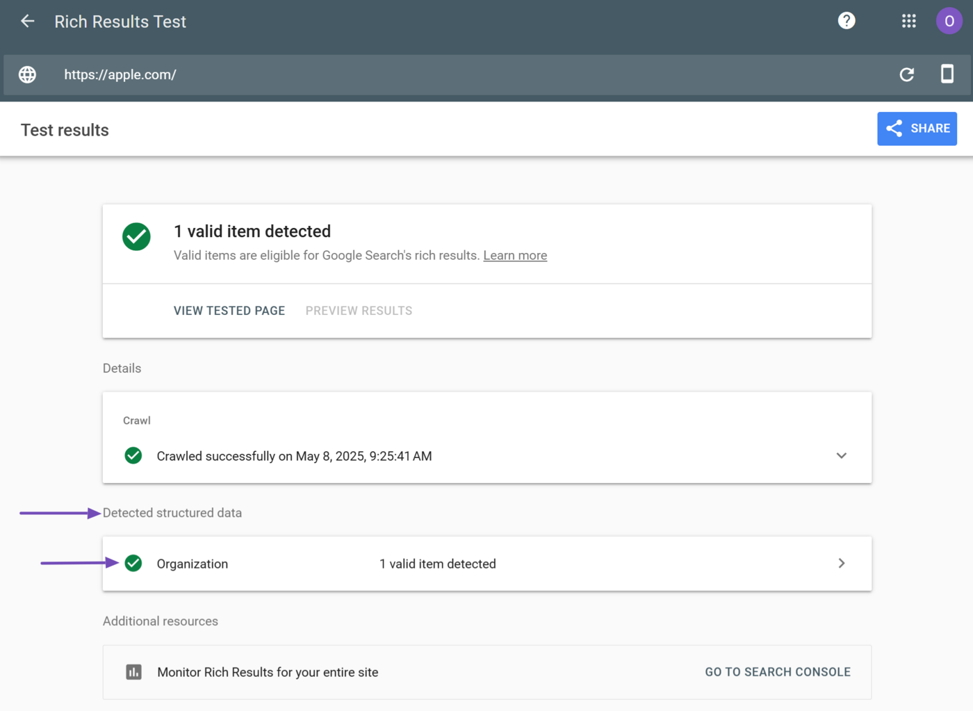 Next, scroll to the Detected structured data report. You will see all the Schema Google found on the page. You can click on any one to further inspect it.